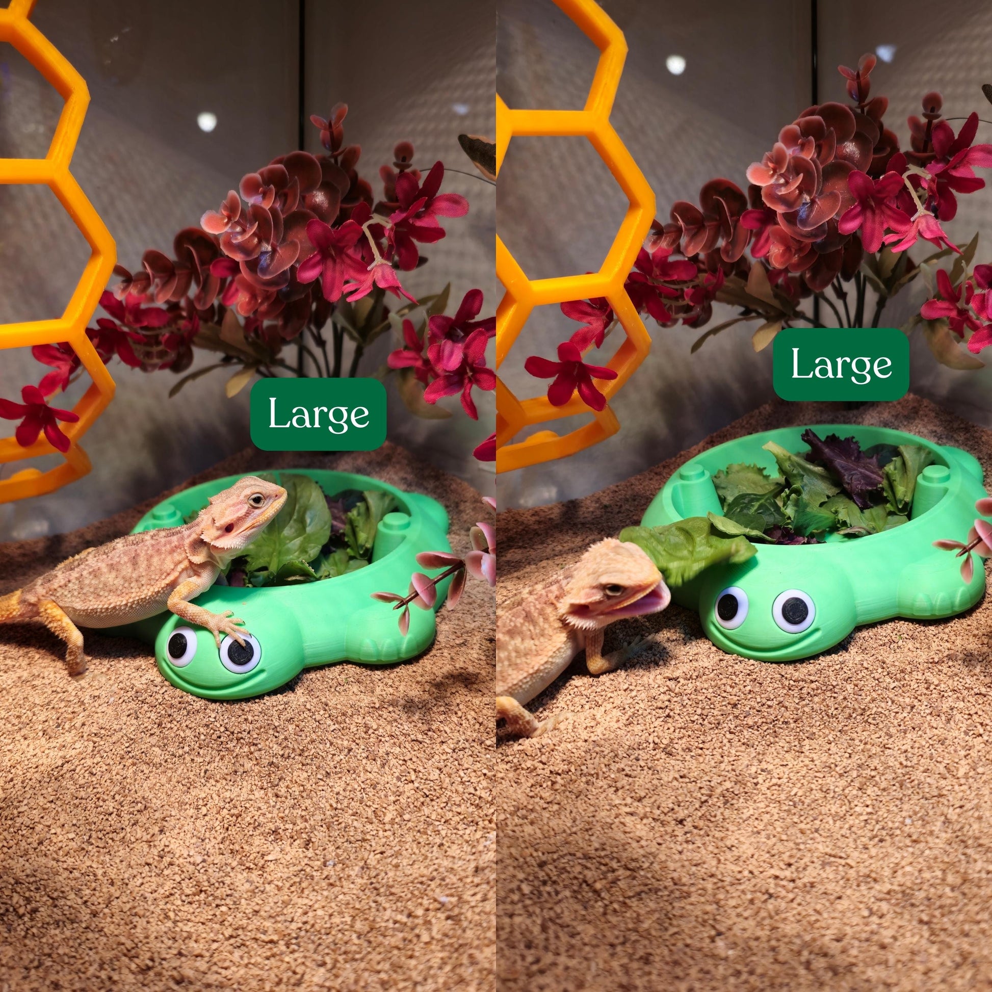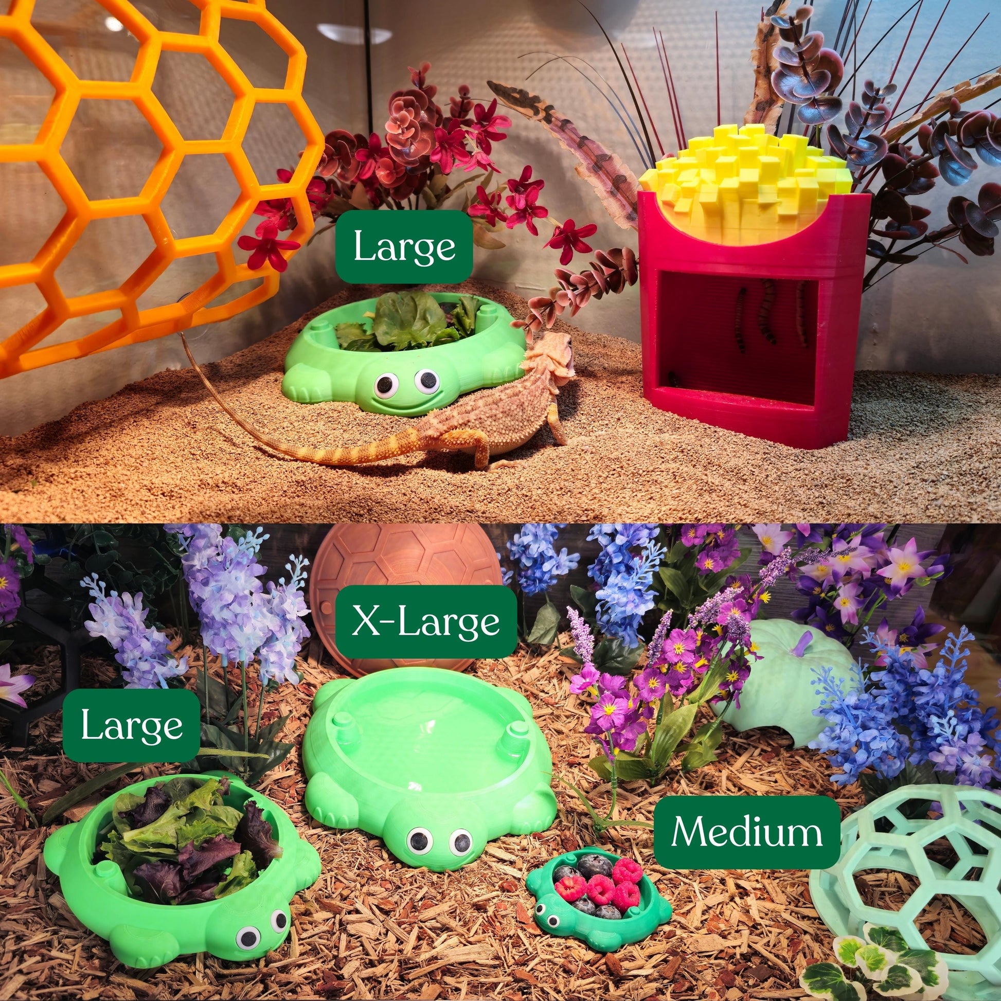 Pet Safety: This item is 3D printed using PLA plastic and is safe for reptile interaction when used as intended. When used as a dish, it is safe for reptiles to eat or drink from provided it is cleaned regularly. If the item becomes damaged or develops loose plastic, discontinue use and dispose of it, as PLA is not intended for reptile consumption.